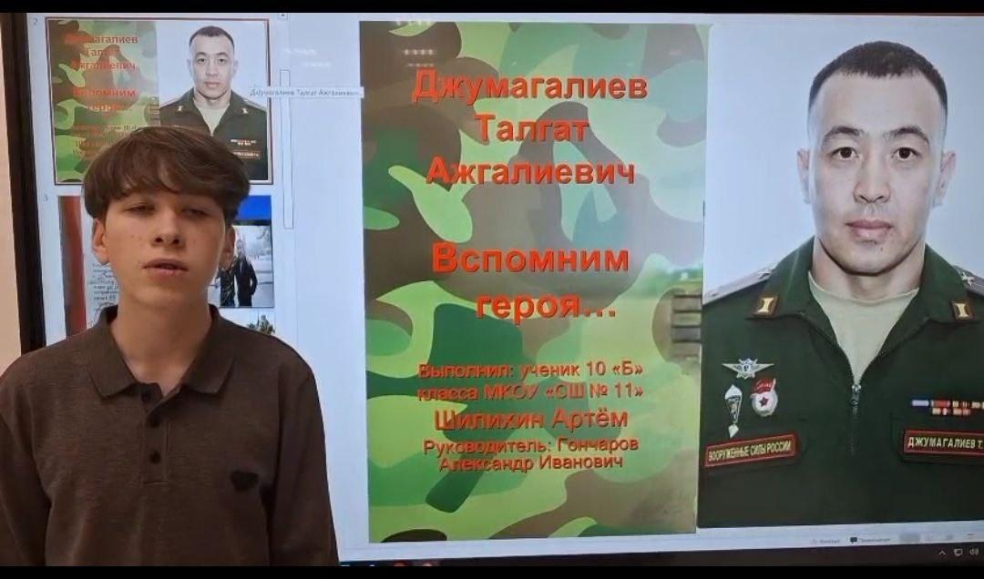 О Герое – земляке Джумагалиеве Талгате Ажгалиевиче рассказал Шилихин Артём, ученик 10б класса. За проявленные успехи в службе Талгату было присвоено звание младший сержант. Неоднократно отправлялся в командировки в «горячие точки». Награждён медалями «За участие в военной операции в Сирийской арабской республике», «За боевые отличия», «За отвагу», «За воинскую доблесть» I и II степени, Орденом Мужества. Погиб, выполняя боевую операцию в зоне СВО. Награждён вторым Орденом Мужества (посмертно).